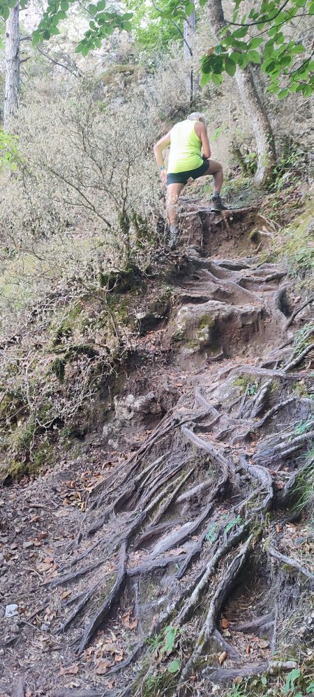 Nous voici dans la partie « effort violent », nous devons remonter en peu de temps pour trouver le départ des passages vertigineux du Cinglegros. Le sentier se dresse tout droit et ce sont des racines qui le stabilisent et servent de marche. C’est au moment où la cuisse pousse que l’on ressent comme une brûlure dans les muscles qui n’est pas souffrance, mais bien être.