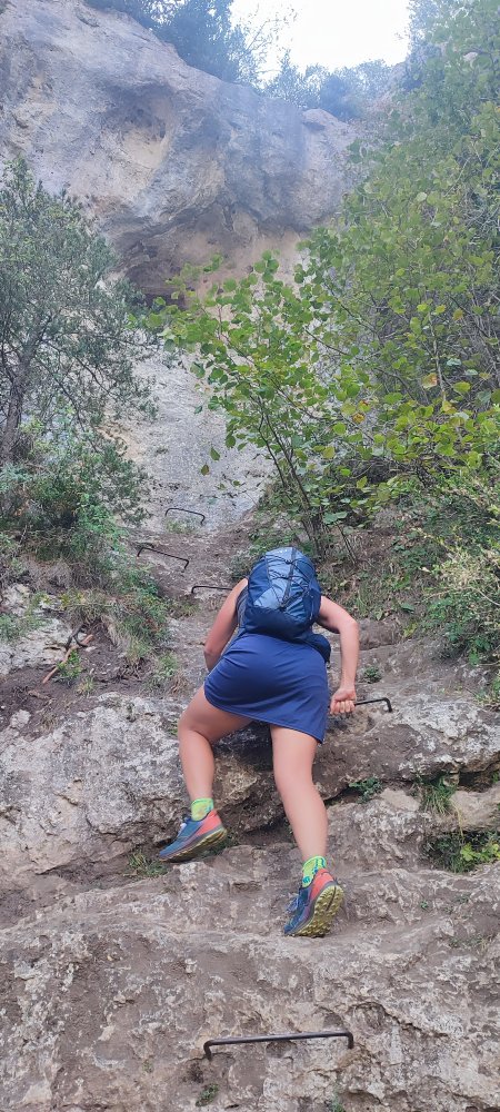 Le sentier se termine et face à la roche du Cinglegros nous devons aussi grimper une paroi. Ce sont des échelons qui vont nous permettre de nous hisser jusqu’à deux échelles.