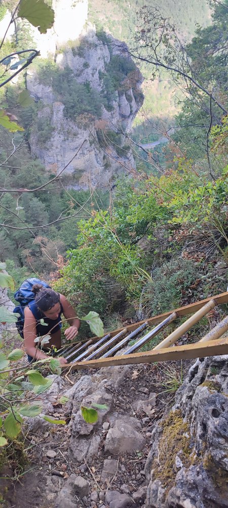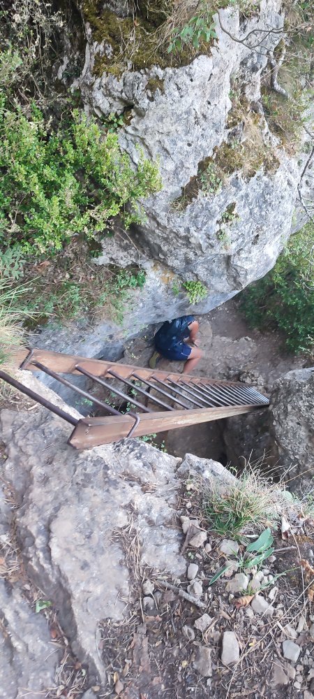 Pas facile la sortie de la première échelle pour reprendre la deuxième d’où l’on aperçoit tout en bas la route qui longe le Tarn.