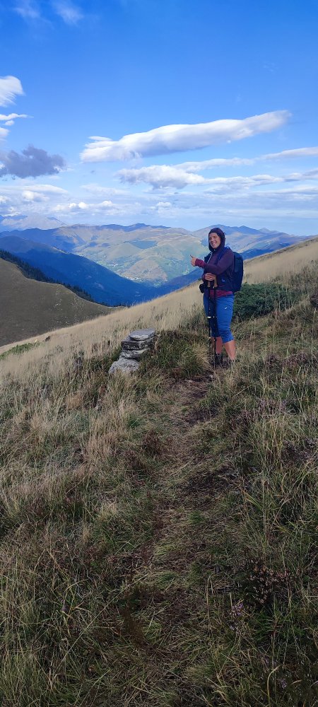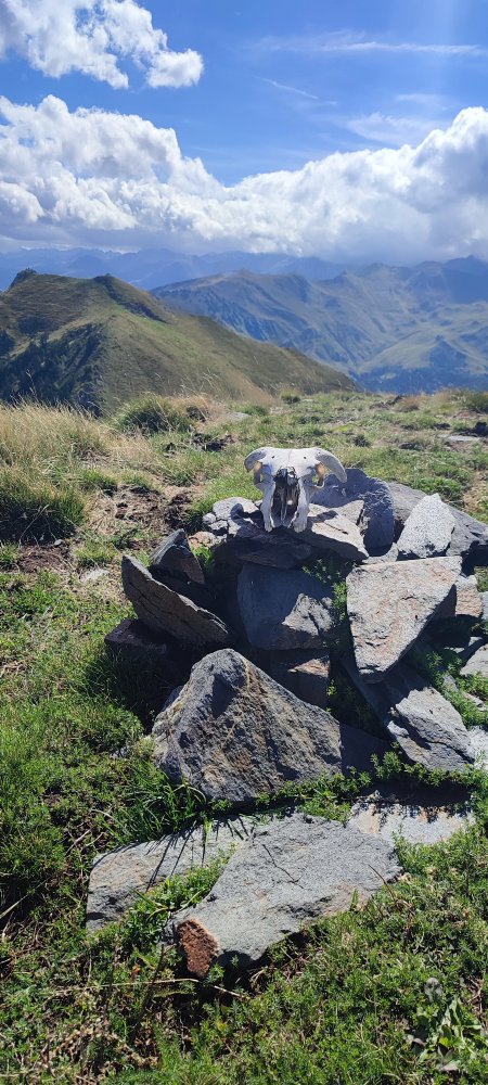 Enfin, nous parvenons au point culminant de notre rando le cap Poilaner 2266 mètres. Le cairn du sommet est décoré de manière particulière, l’on dirait que le vautour gypaète barbu a mal fait son boulot.