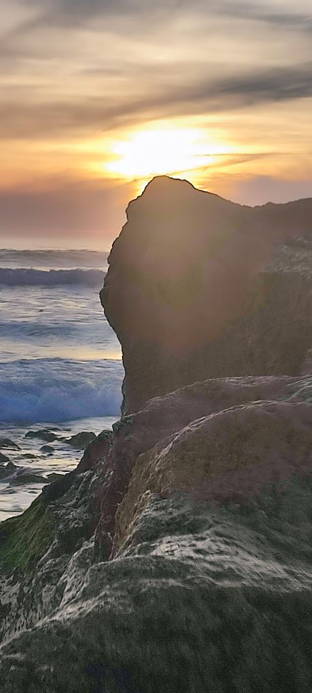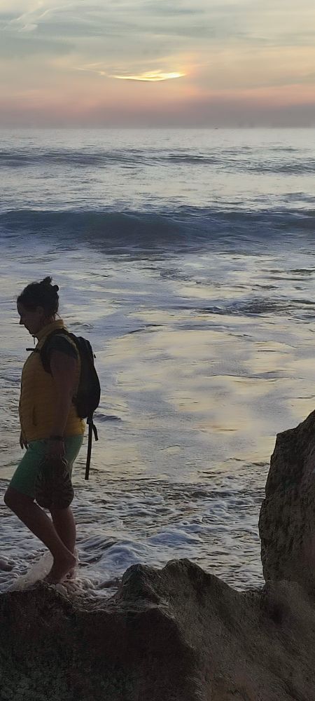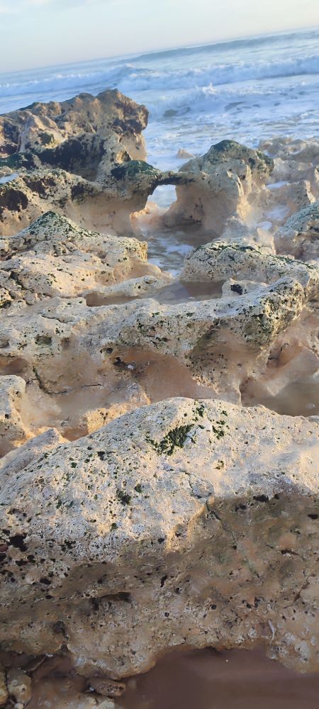 Nous terminons la journée avec quelques pas sur la plage. Coucher de soleil, rochers travaillés par le mouvement des vagues.