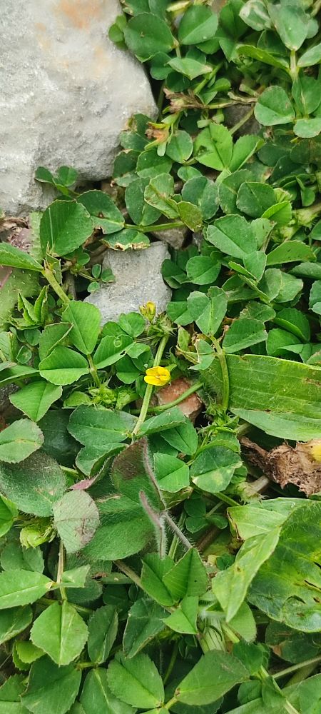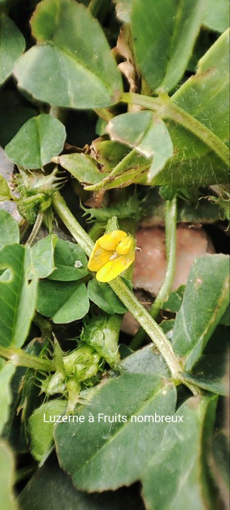 Une fleur jaune, la Luzerne à fruits nombreux ou une autre de couleur mauve, la rubéole des champs.