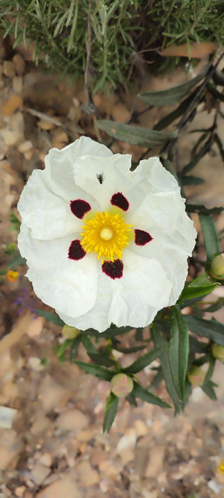 le ciste à gomme aux grandes fleurs blanches avec des taches pourpres d’une finesse incroyable..
