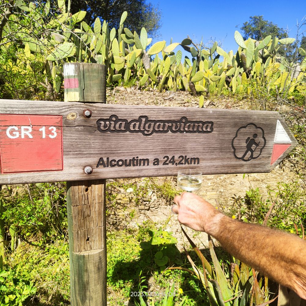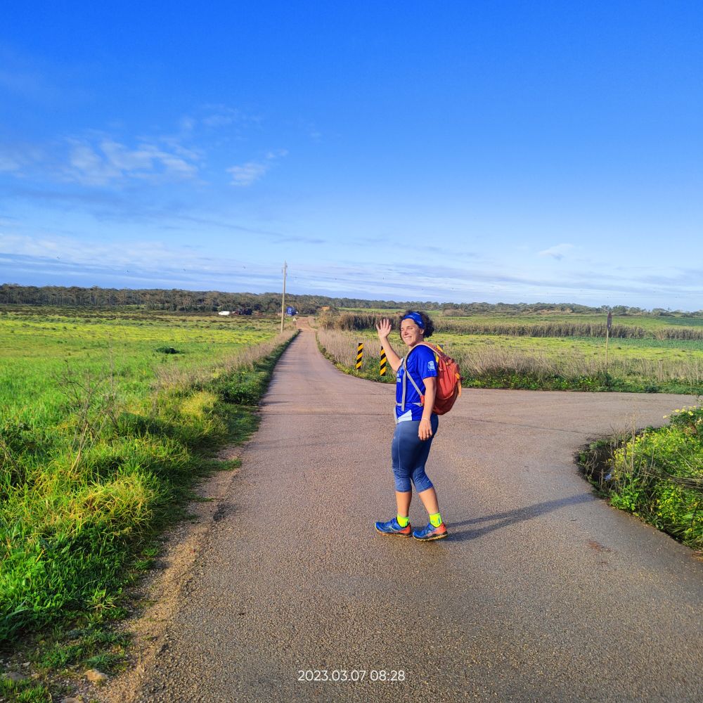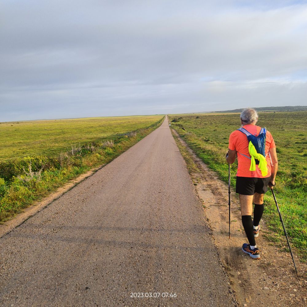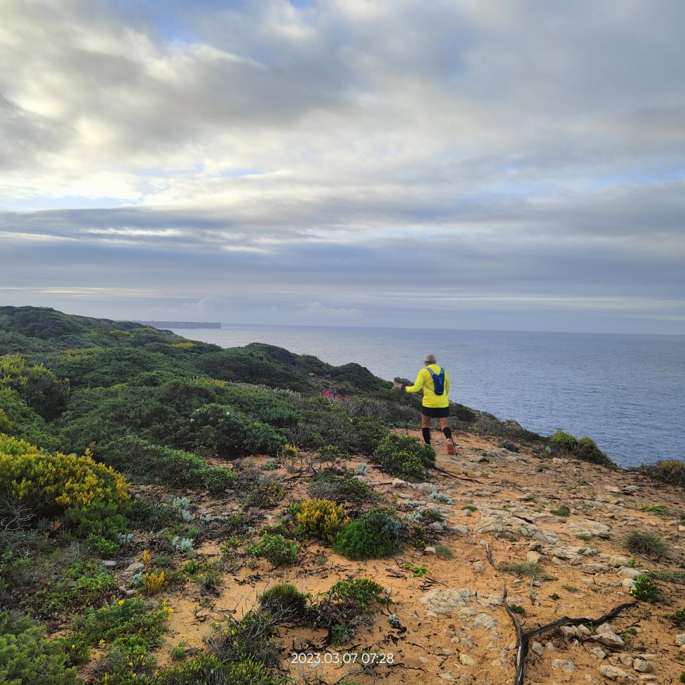 En ce matin du 7 mars 2023 Laetitia me donne le départ à 7hO7, normal cette a kinnée je vais avoir mes 70 ans. C’est avec joie que Laetitia m’annonce qu’elle m’accompagne sur les 7 premiers kilomètres. Le reste du temps, elle va assurer l’intendance. Mais pour l’instant pas question de courir mes deux tendinites aux tendons d’achille me font trop souffrir. Donc je marche au-dessus des falaises du cap Saint-Vincent.