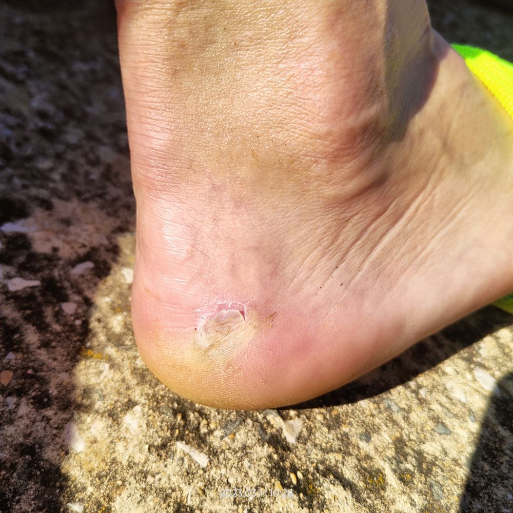 La pluie s’invite après la pause de midi, je change de chaussures. Je ressens rapidement un frottement, mais le mauvais temps ne m’incite pas à l’arrêt, erreur! Le soir, deux ampoules illuminent mes talons.
