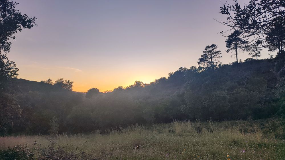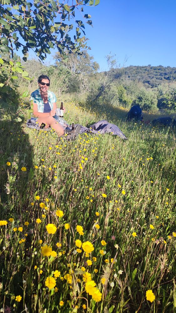Arrivés avant qu’elle ne se lève, nous nous prélassons au milieu des liondents et des épervières qui de leur jaune nous éblouissent et nous arrosons notre futur voyage.