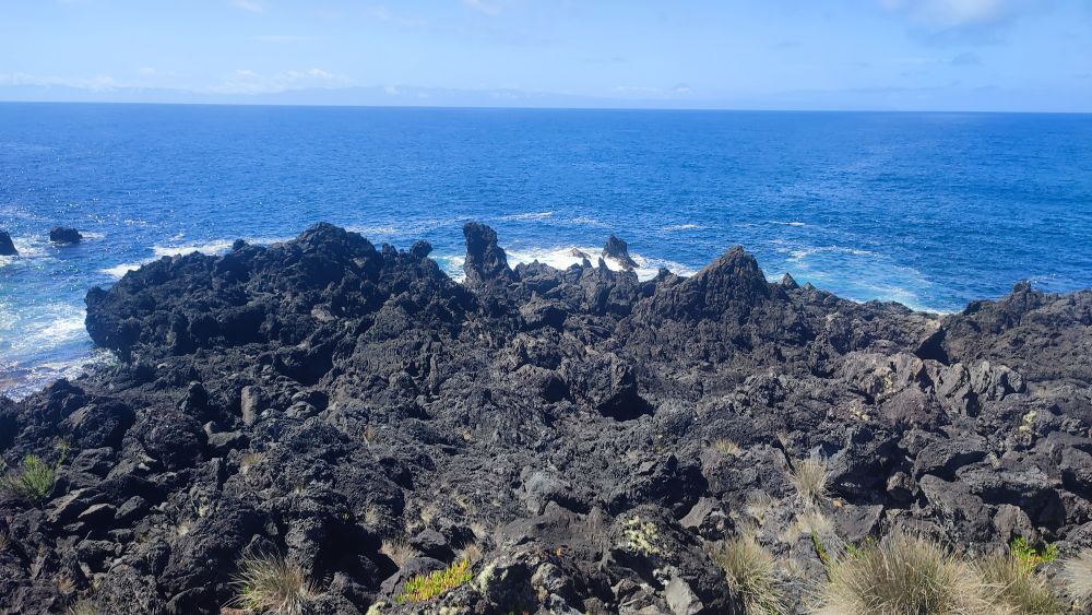 Nous retrouvons le bord de mer où cette roche d’un noir prononcé est de la lave qui fût refroidi brutalement par l’océan.