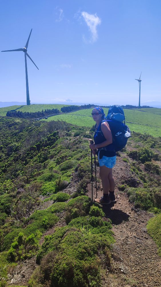 Sur le sentier de crête de la caldeira, les éoliennes nous ramènent à notre monde moderne, mais c’est l’une des seules sources d’énergie de l’île.