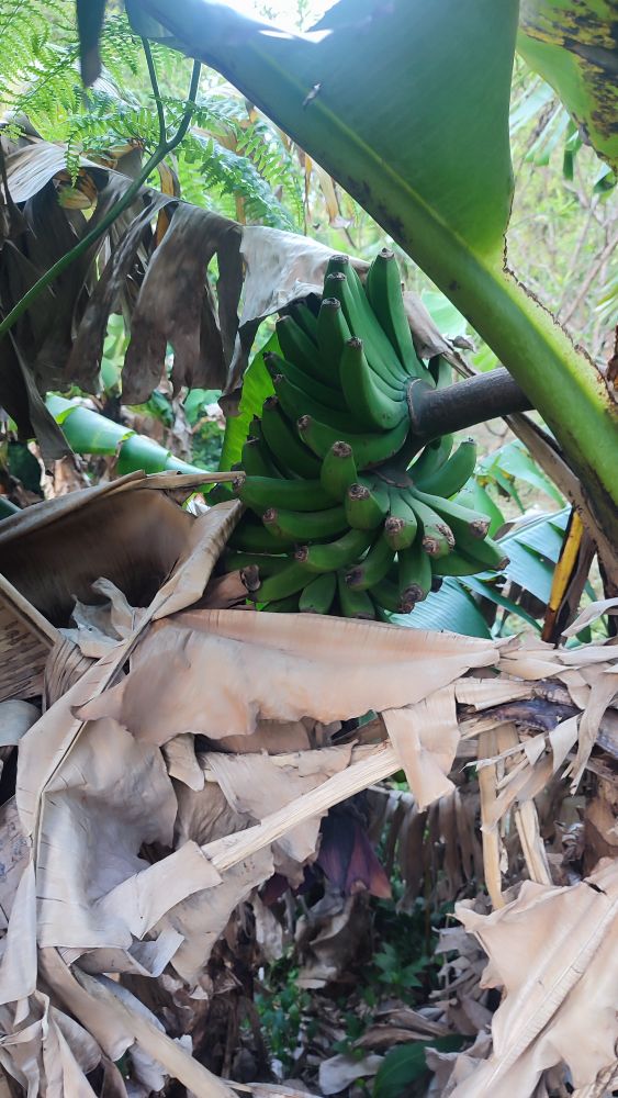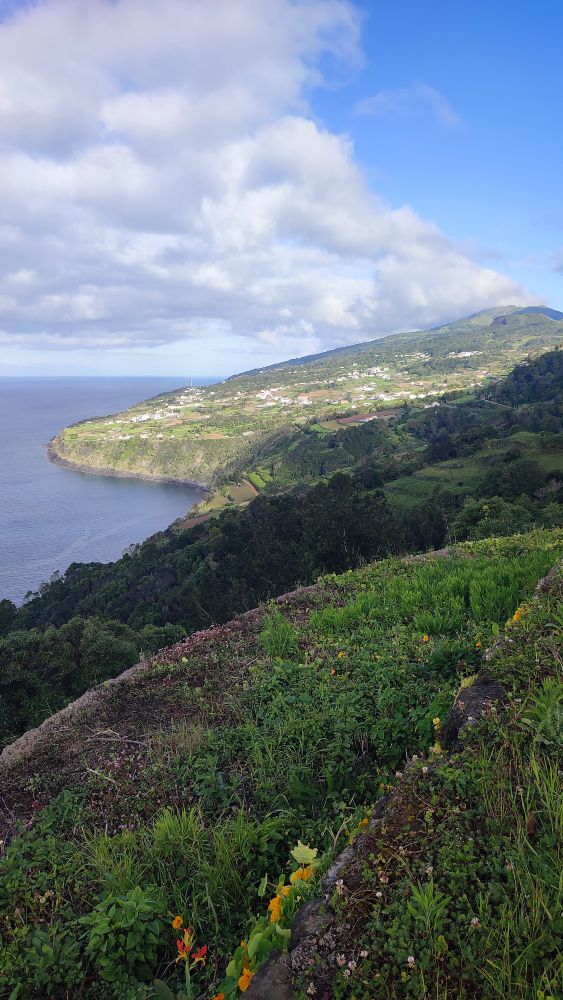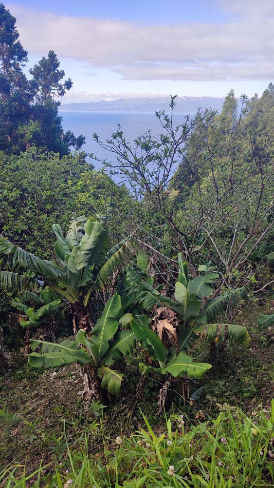 Nous longeons le fajā de Gragueira, il y a trois maisons et les terrains agricoles sont entretenus avec des cultures variées : pommes de terre, oignons mais aussi des vignes, des pieds d’ananas et des bananiers.