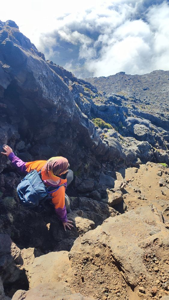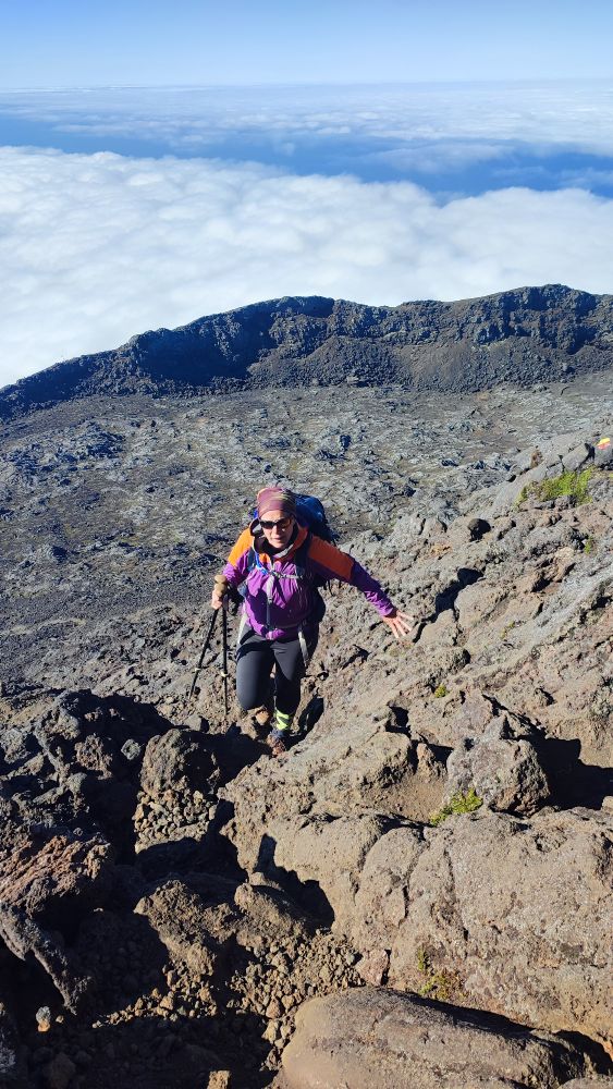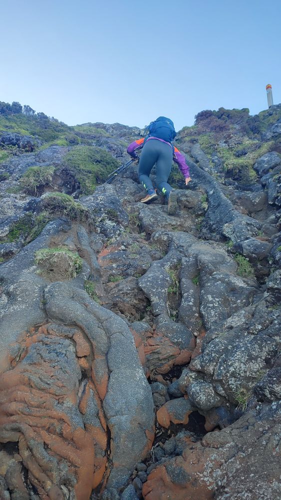 La montée est exigeante, de par l’importance du pourcentage de la pente, mais aussi par la technicité. Nous devons réaliser une cohésion avec cette roche de lave que nous n’avons pas l’habitude de côtoyer.