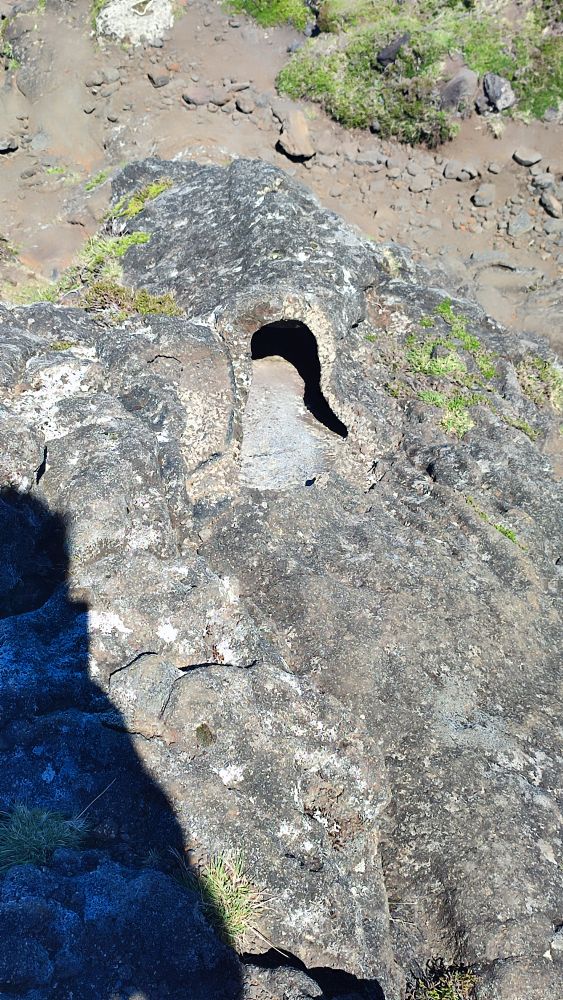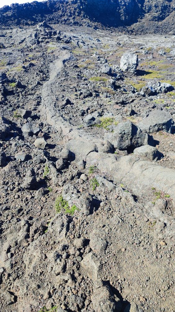 On distingue bien les tunnels de lave. Ici la lave s’est écoulée doucement, petit à petit elle s’est refroidie en surface pour former une croûte. Mais l’intérieur a continué à s’écouler ce qui forme des tunnels sur les flancs du volcan.