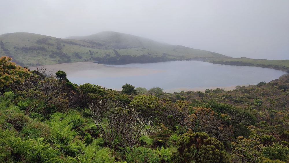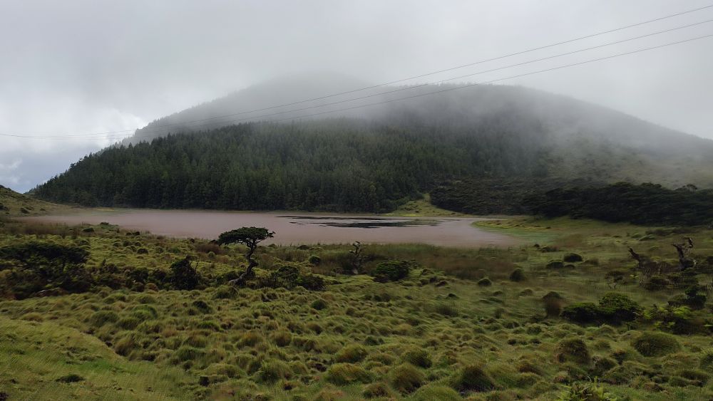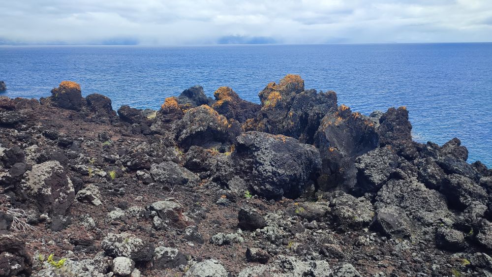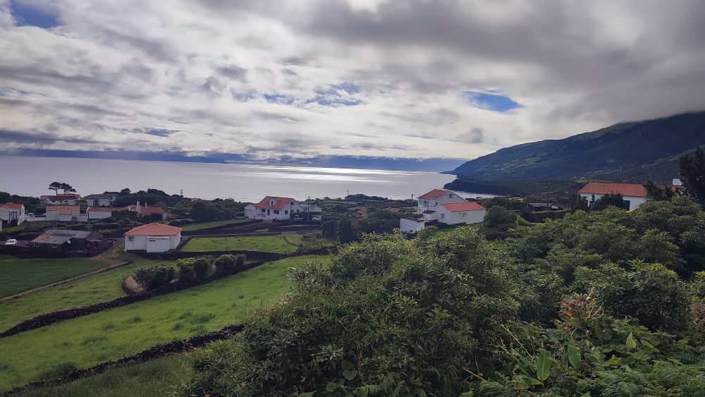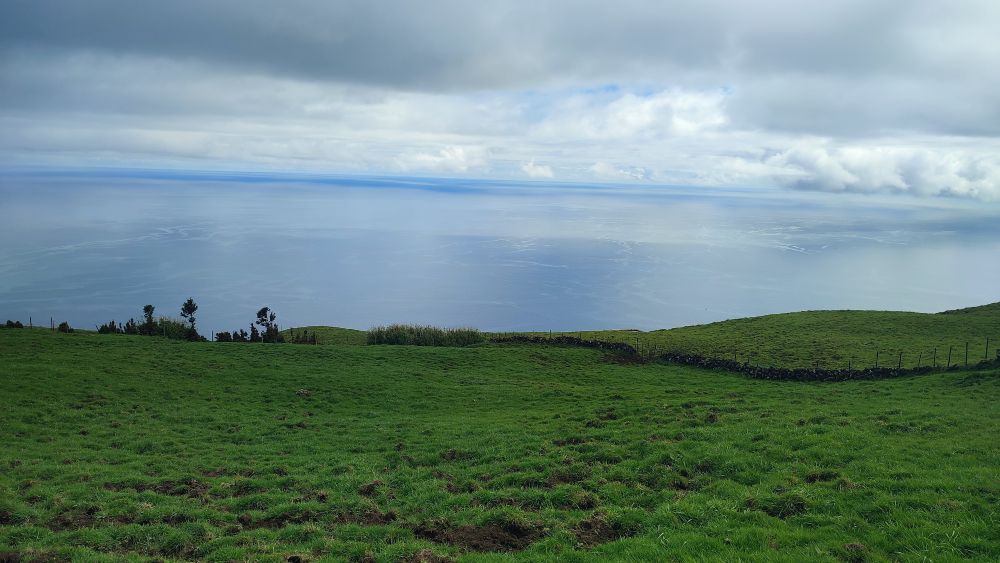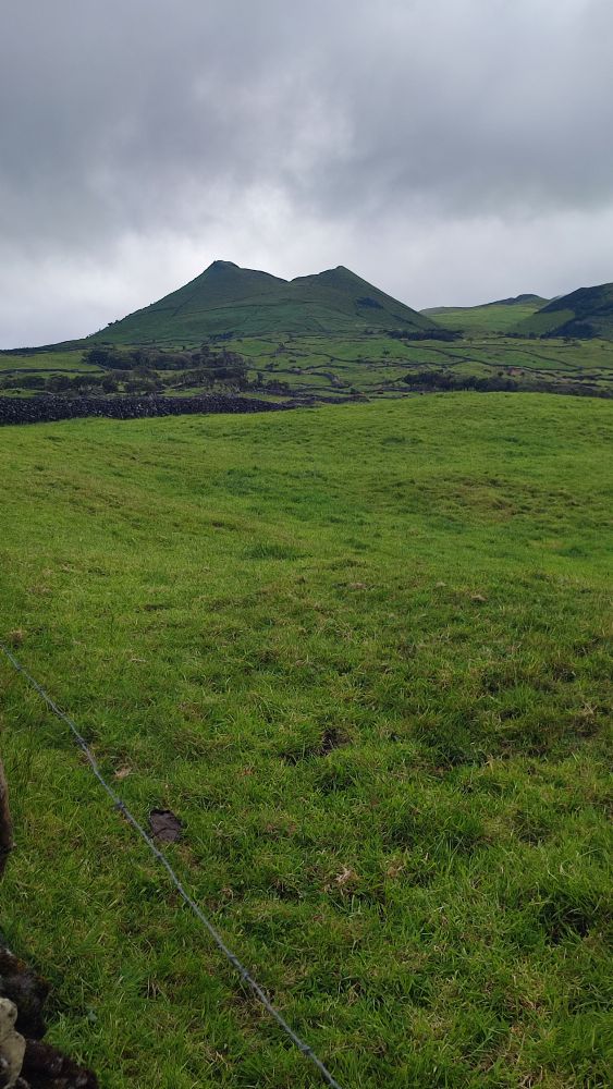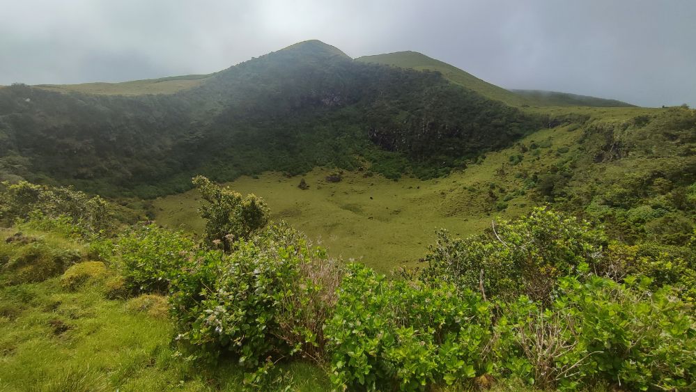Nous abordons une chaîne d’anciens cratères occupés aujourd’hui par l’élevage. Nous avons même droit à un panorama sur l’océan. On y croit, le ciel pour nous va se dégager.