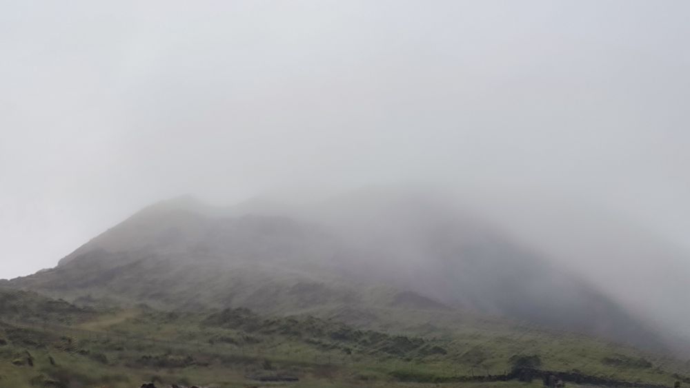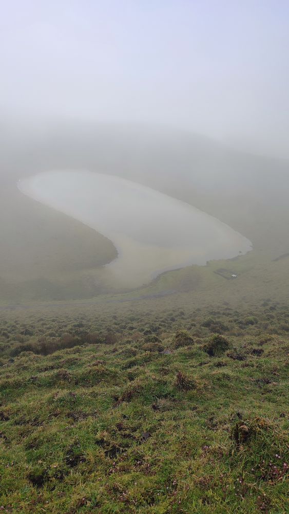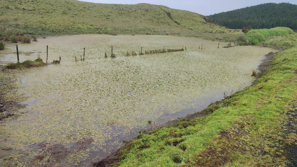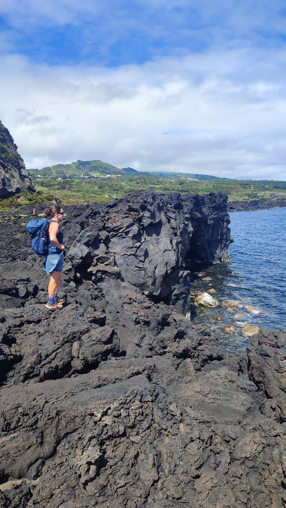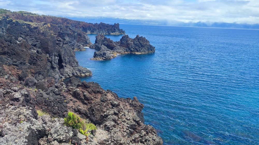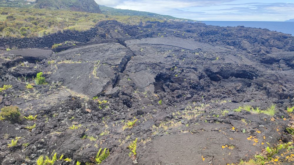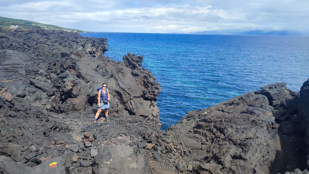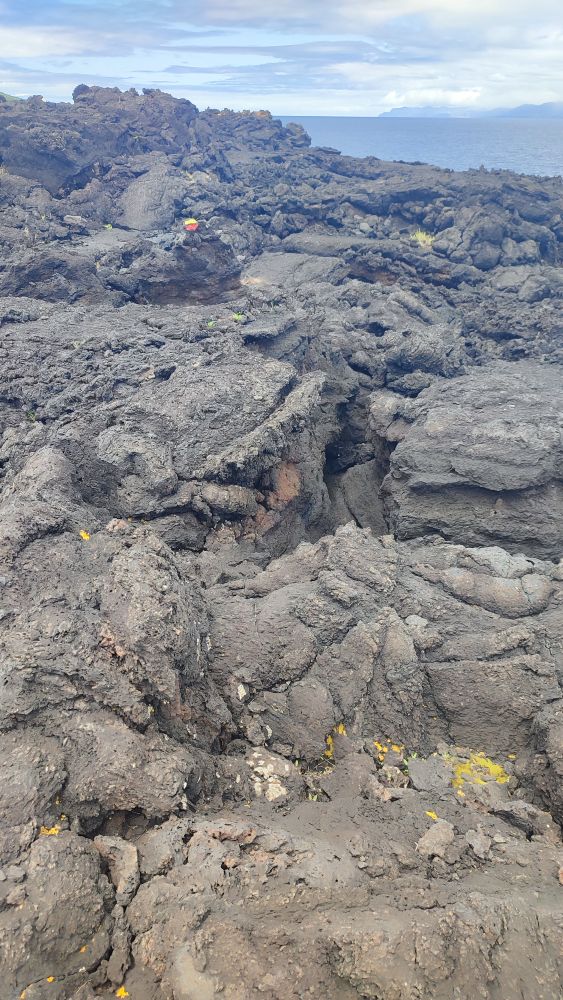 Nous abordons une chaîne d’anciens cratères occupés aujourd’hui par l’élevage. Nous avons même droit à un panorama sur l’océan. On y croit, le ciel pour nous va se dégager.