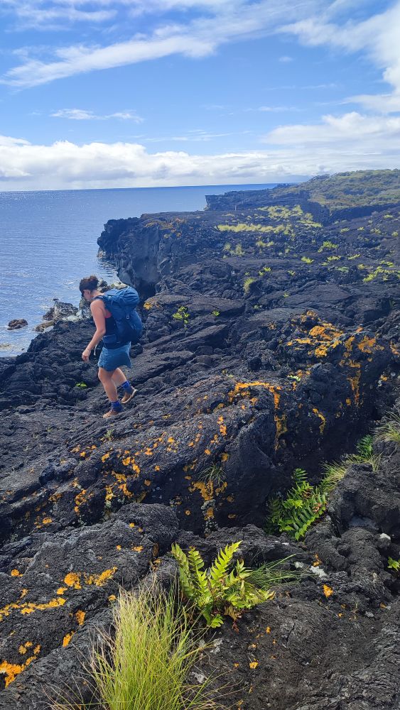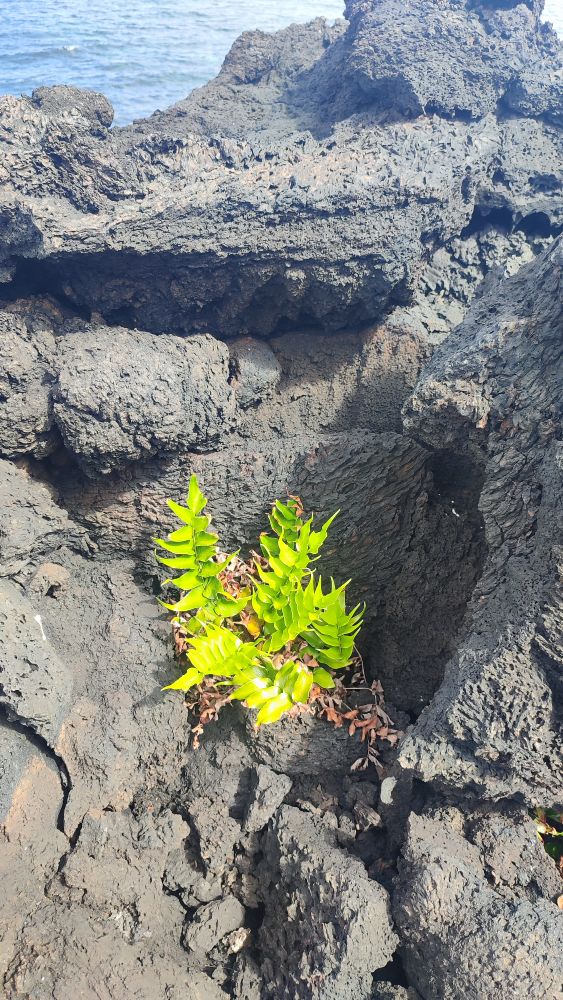 C’est un spectacle à chaque pas, le mariage de cette roche de lave noire avec l’océan et son mouvement incessant, les plantes qui trouvent la force de pousser telle cette fougère du nom Aspidie en faux.