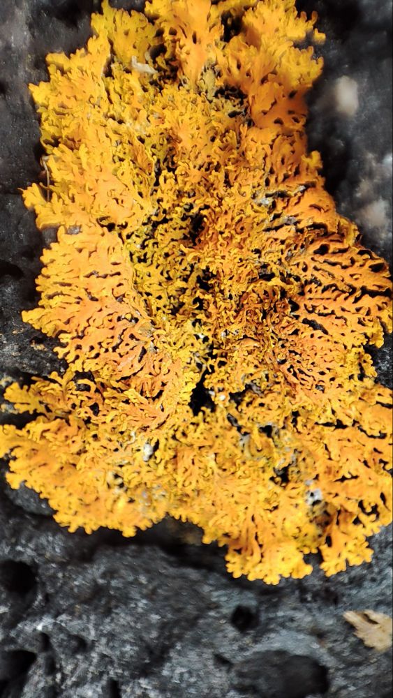 C’est une randonnée en aller retour, et en revenant sur nos pas nous admirons ces roches envahies par un lichen orange qui, regardé de près, est une belle broderie.