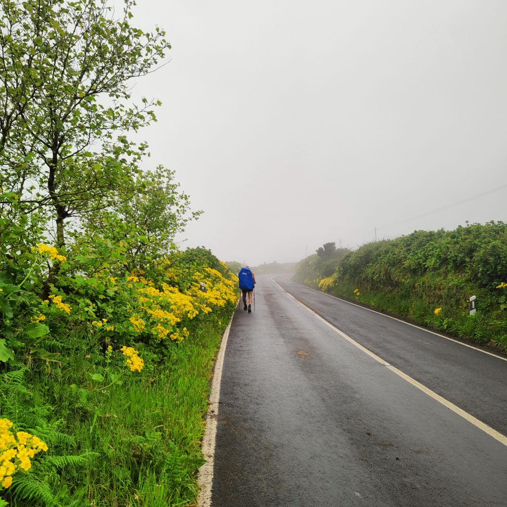 Pour retrouver le départ du sentier de randonnée, nous devons effectuer huit kilomètres sur une route, heureusement peu fréquentée.