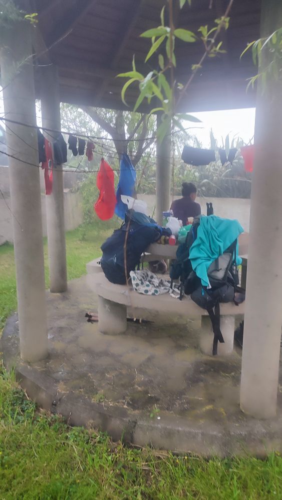 Dans cette grange il y a aussi des gouttières, mais l’espace est grand, un banc contre un mur est au sec, nous pouvons y placer nos sacs.