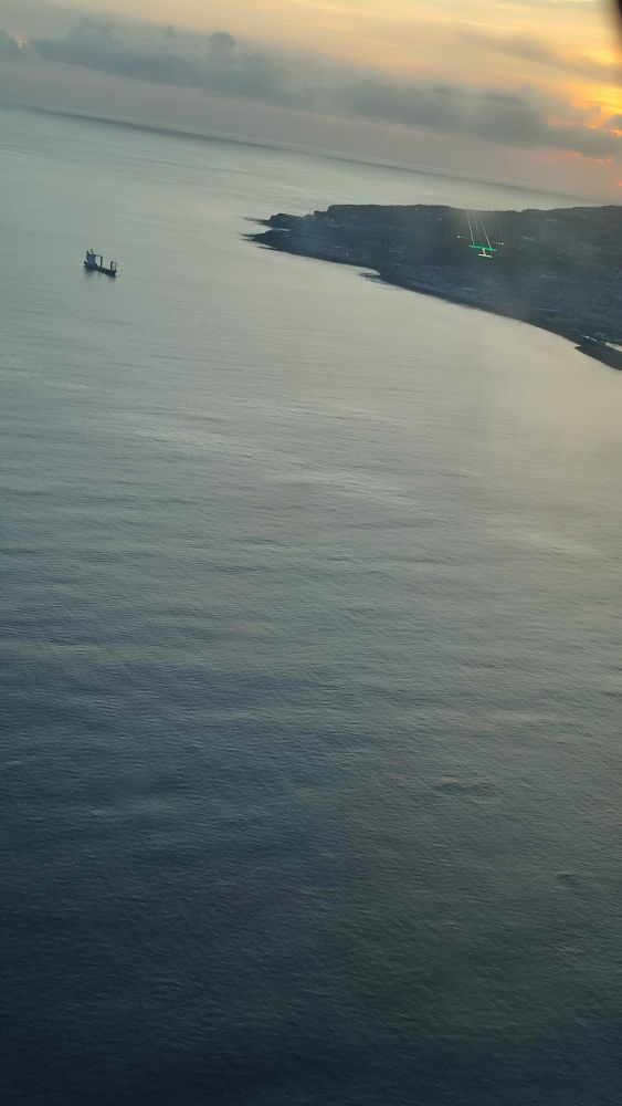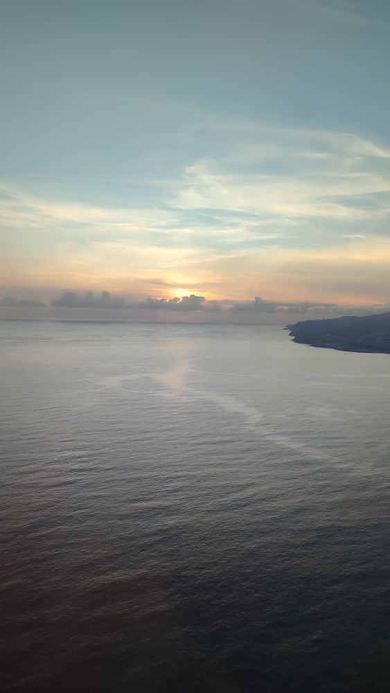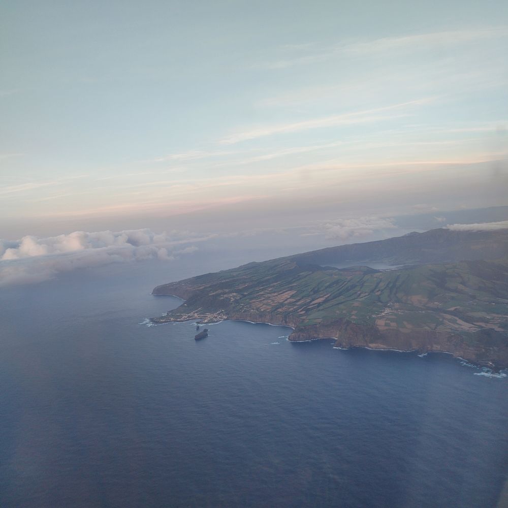 Avant l’escale sur l’île de Sao Miguel nous profitons depuis l’avion du site des Sète Cidades, du coucher du soleil et d’une vue sur la piste d’atterrissage.