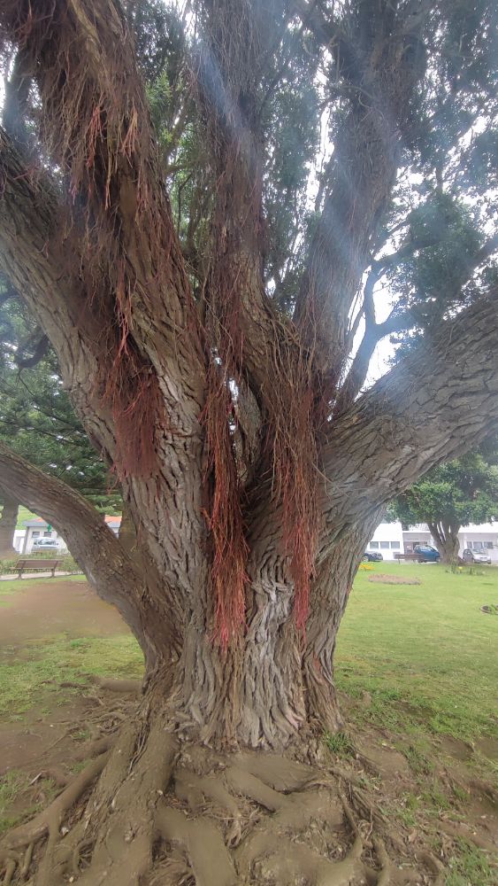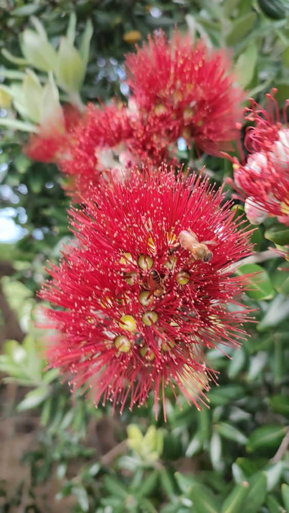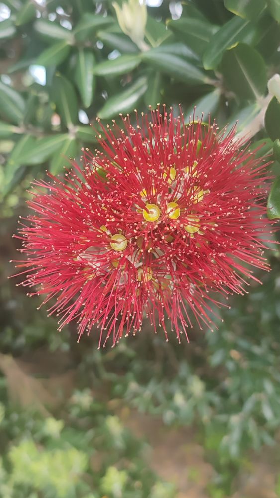 C’est un Pohutukawa, arbre de Nouvelles Zélande sacrée pour les Maoris. Il est considéré pour eux comme l’arbre de Noël car à cette période il produit une masse de fleurs rouges en pointes brillantes.