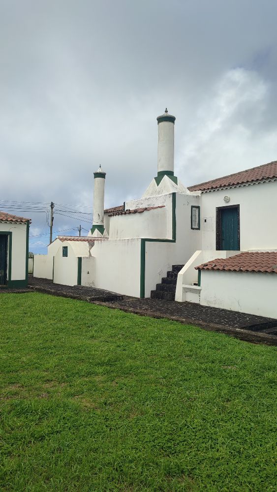 Voici l’architecture typique de cette île, des cheminées et ici toutes les maisons sont blanches avec des bordures vertes.