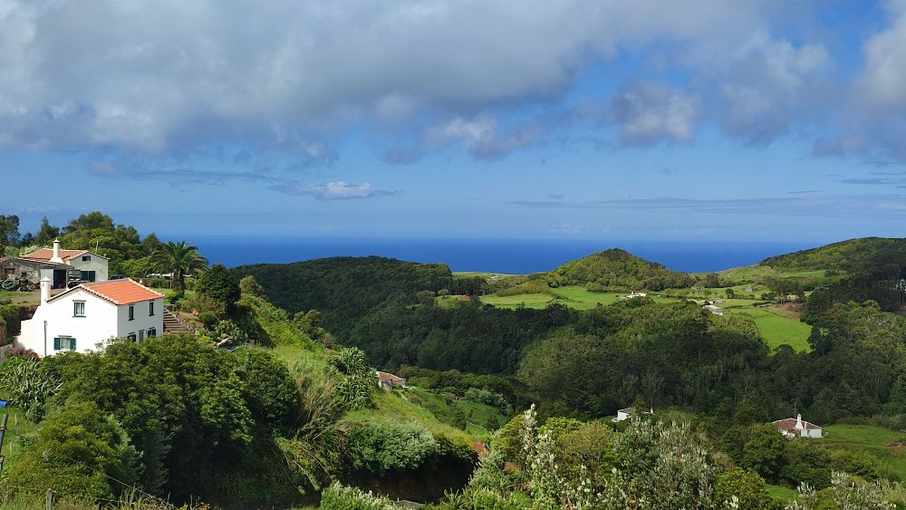 Paysages typiques, terres d’élevage, des maisons éparpillés et le bleu de l’océan toujours à portée du regard.