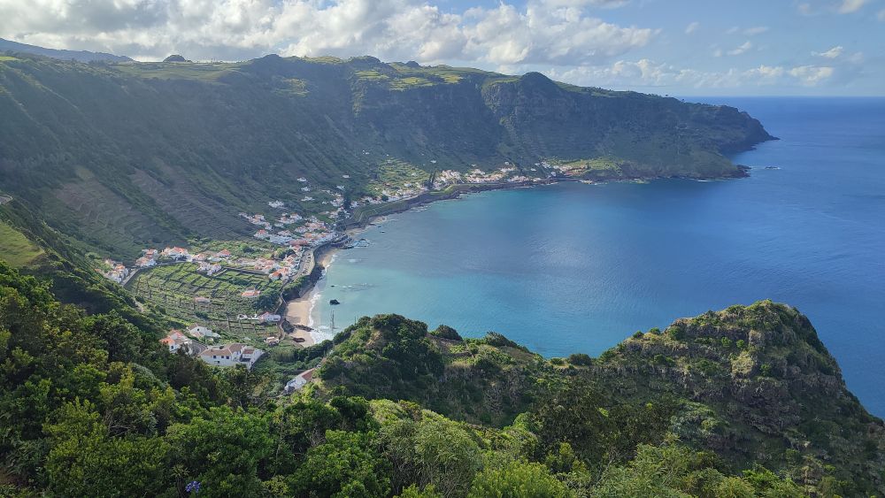 La montée se termine dans le village de Esperito Santo, l’église est imposante, mais pour nous s’impose une grande pause au bar du village.