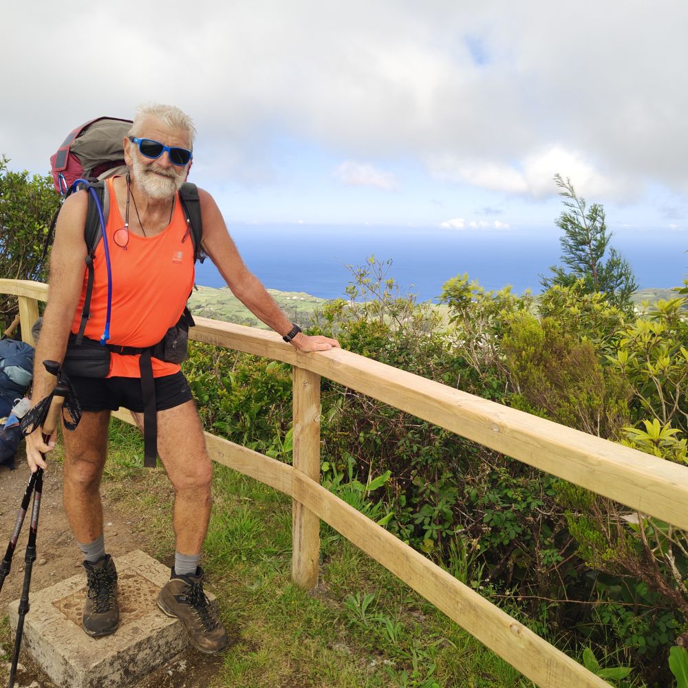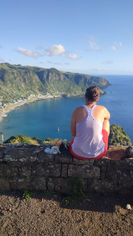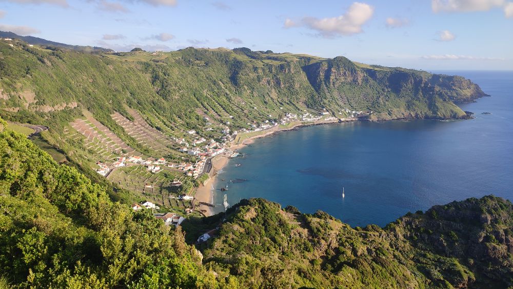 Comme nous sommes des matinaux, pas un seul bar d’ouvert donc pas de café pour nous donner une légère excitation afin de grimper ce Fajãzinha. Escalier historique grimpant dans ces vignes : 246 mètres de montée en 1,5km. Terrible pour les randonneurs avec 15 kg dans le dos.