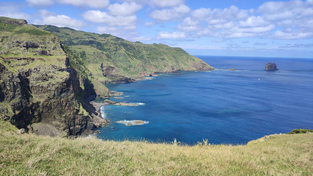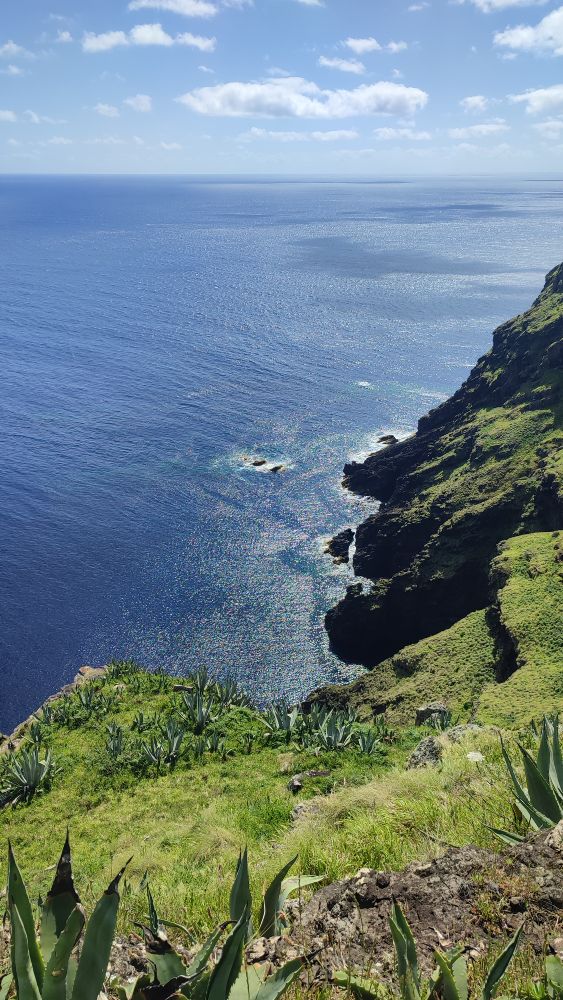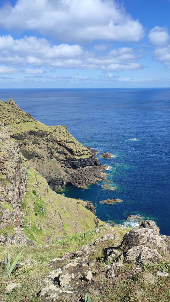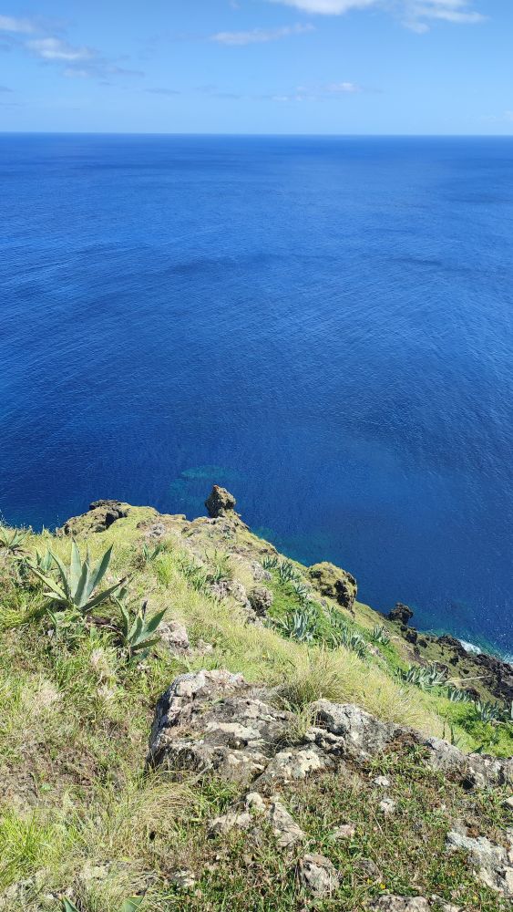 Nous déjeunons face à la baie de Sao Lourenço. On distingue bien la culture de la vigne au milieu de petits enclos de pierres de lave qui montent au ras des falaises.