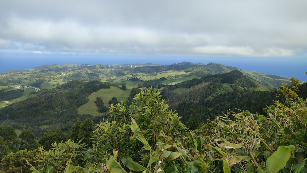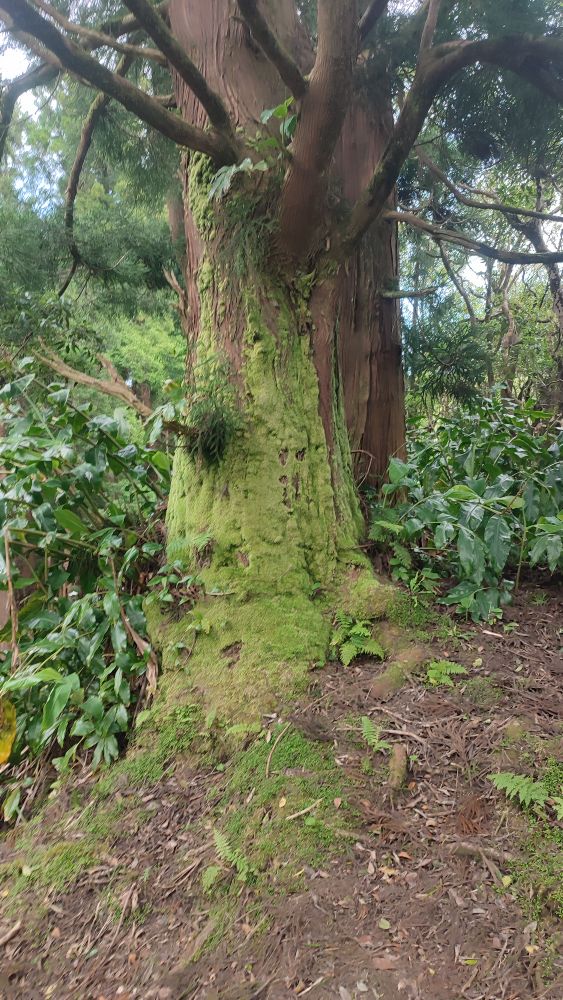 Nous contournons une caldeira, mais la vue se limite aux troncs des arbres.