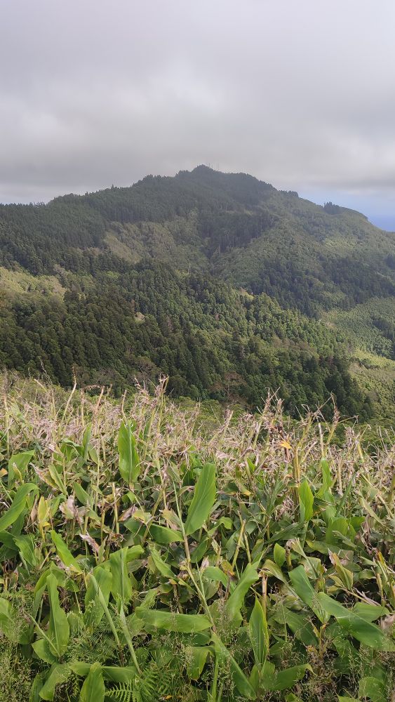 Puis, notre après-midi est un peu lassante et fatigante. Nous devons accéder au sommet de l’île à 587 mètres d’altitude. Tout d’abord nous descendons un sentier très boueux et glissant pour remonter l’identique. Nous acceptons cette difficulté même si nous nous dirigeons à l’opposé du sommet que nous convoitons. On s’explique cela en se disant c’est pour nous éviter de marcher sur la route. Mais en définitive à la sortie de ce sentier difficile nous marchons quatre kilomètres sur route dans une forêt où il fait très lourd. J’arrive au sommet, ma forme est bien entamée.