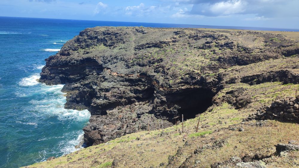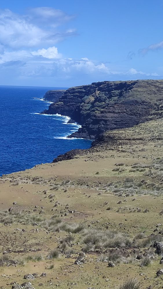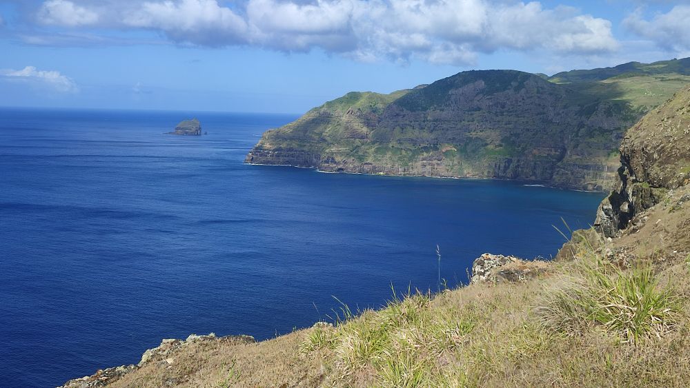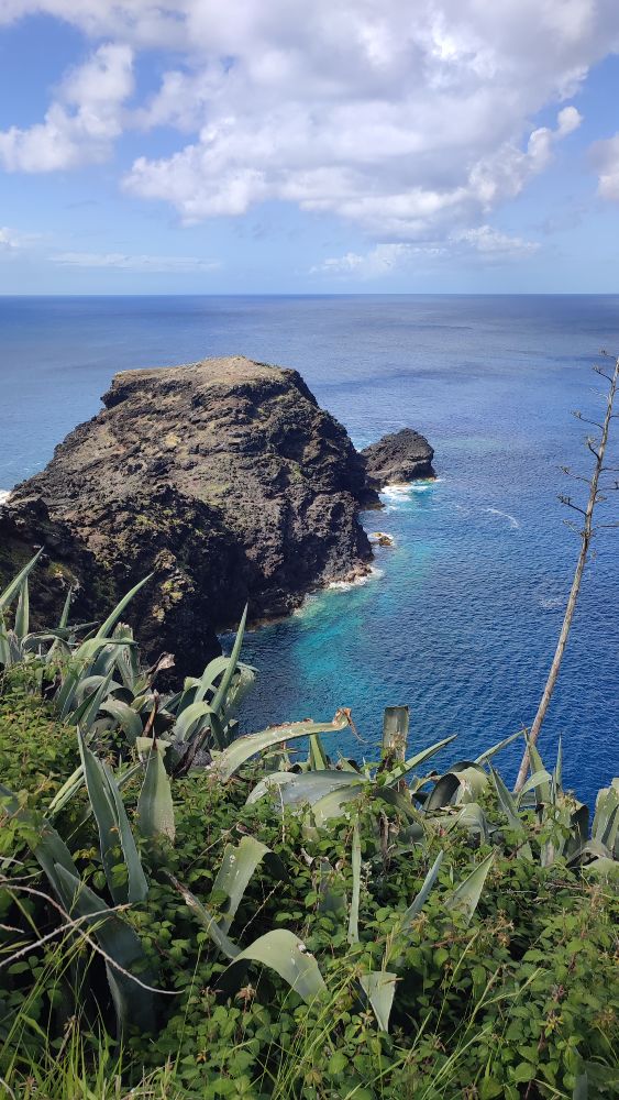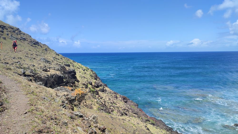 Notre sentier se poursuit le long d’une côte déchiquetée où l’océan d’un bleu turquoise avec des effets de vert et d’écume blanche ne peut que nous extasier.