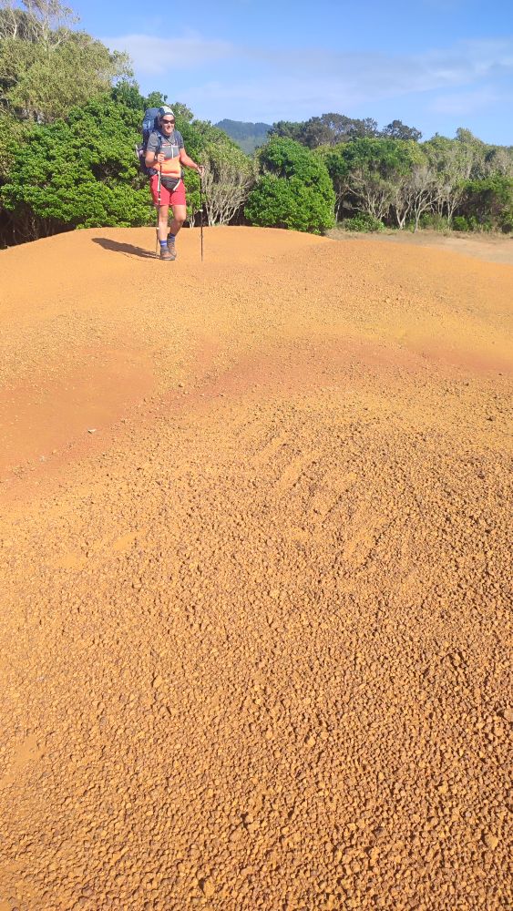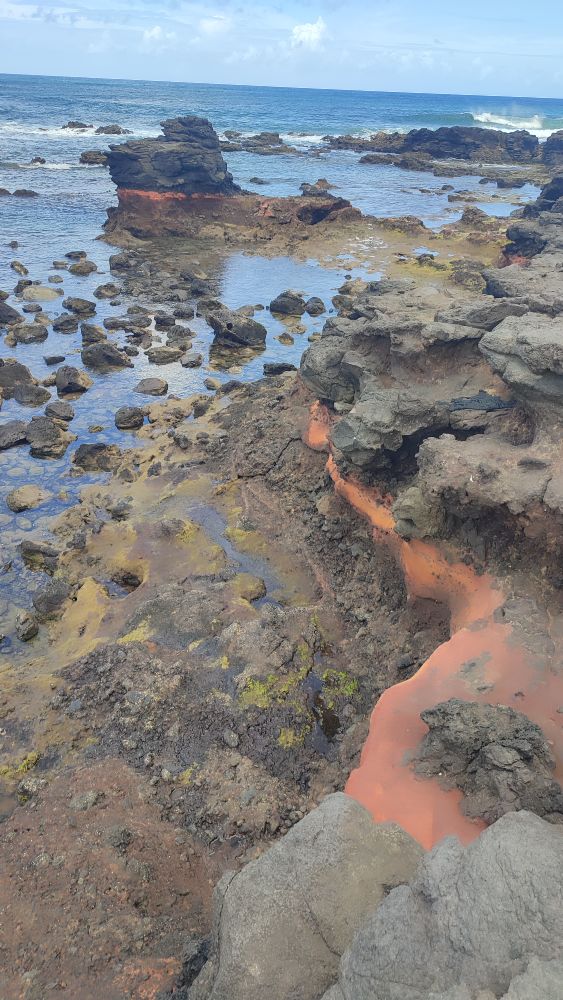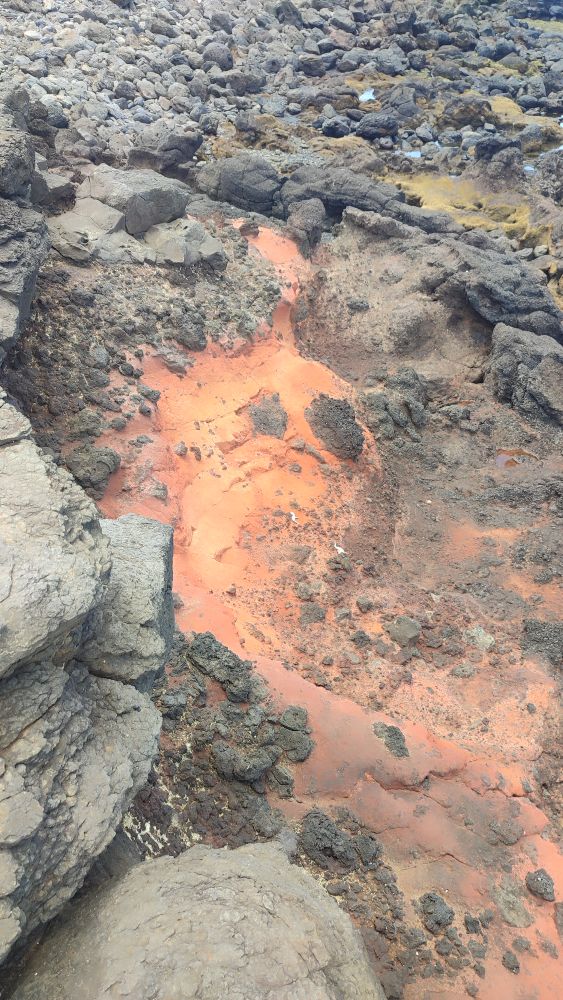 Avant notre pause de midi au niveau de la mer, nous sommes surpris par cette saignée rouge vif dans la roche noire.
