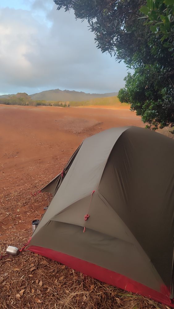 Et nous espérons un coucher de soleil sur l’océan. Mais les nuages en décident autrement alors nous revenons sur nos pas et installons la cabane aux portes du désert.