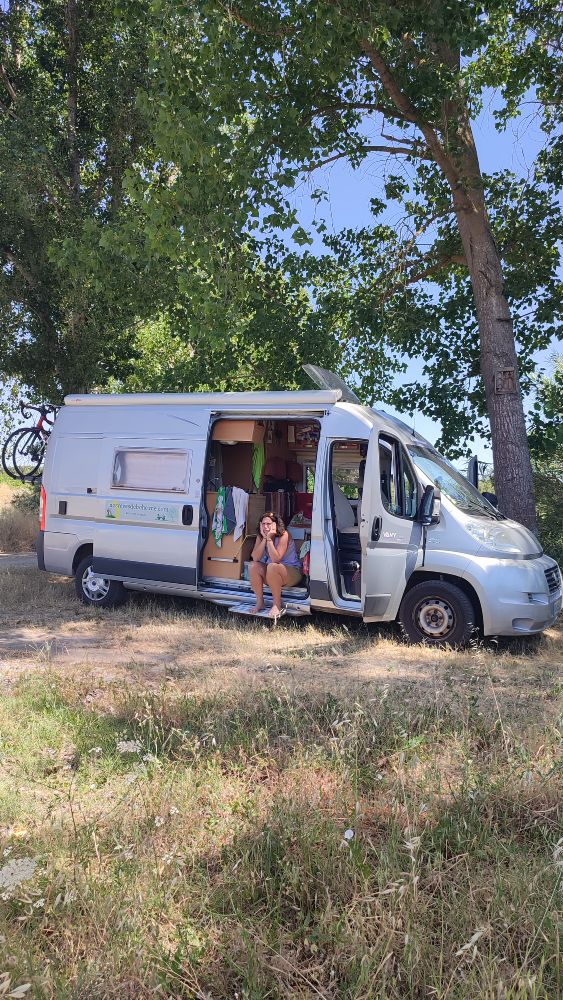 Laetitia grâce à park4night dégote un endroit proche d’un ancien ermitage entouré de grands peupliers qui nous offre de l’ombre et d’où j’écris ces quelques mots. Au loin j’entends le loriot, au-dessus de moi des pies ibérique jouent dans les branches et d’autres oiseaux chantent à tue tête.