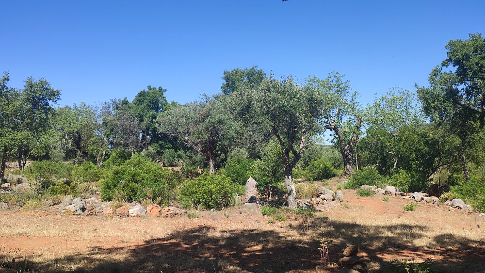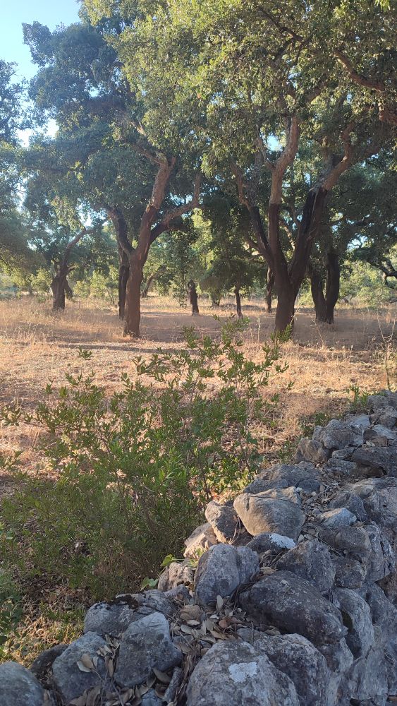 Notre regard se porte sur une plantation où se côtoient chênes-liège, chênes-vert et pins, l’herbe est dorée comme les blés prêts à être moissonnés.