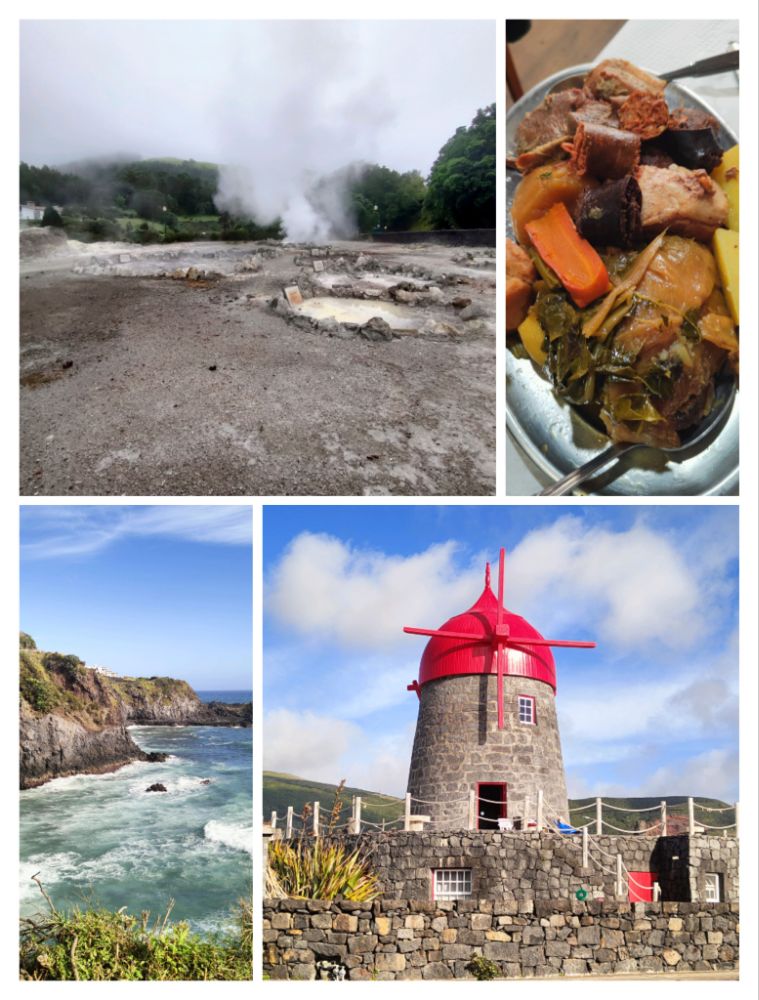 — Et surtout si vous avez le temps au mois de mai ce sont les Açores qui vous attendent. Des hortensias en fleur partout, c’est envoutant. Vous qui aimez la randonnée, grimpez au sommet du Portugal le Mont Pico, un ancien volcan à plus de 2300 mètres. Si les Dieux sont avec vous de là-haut, vous aurez une vue sur tout l’archipel des Açores, profitez aussi de cette île pour déguster un vin de lave. Sur l’île de Sao Miguel, dans la ville de Furnas, le volcanisme n’est pas loin, eaux chaudes, boues bouillonnantes, goûtez le cozido, un pot-au-feu qui cuit environ sept heures à la chaleur de la terre.