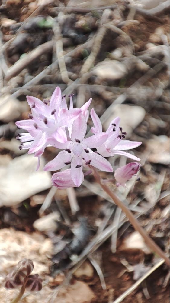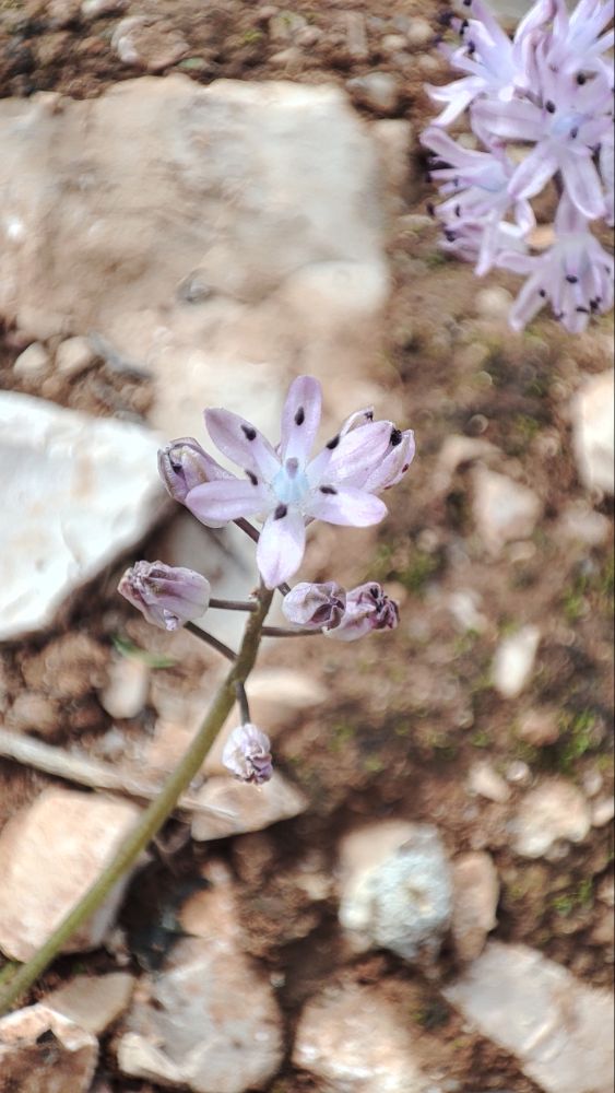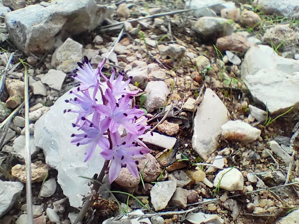 Dans cette rude ascension où les pierres roulent, se cachent la Scille d’automne, les étamines ont déjà ouvert leurs sacs à pollen et ont l’extrémité bleutée.