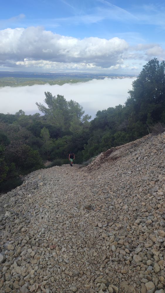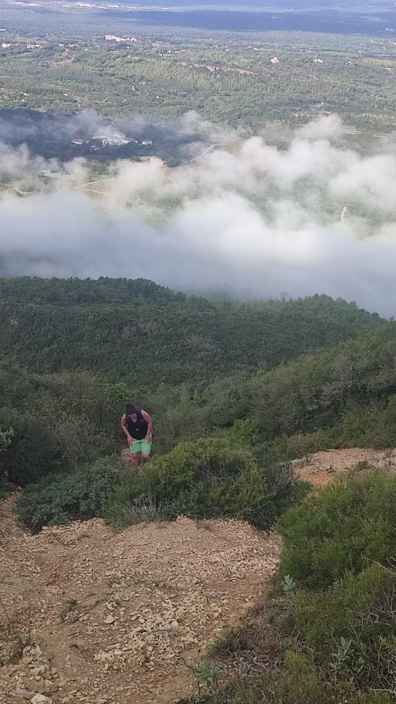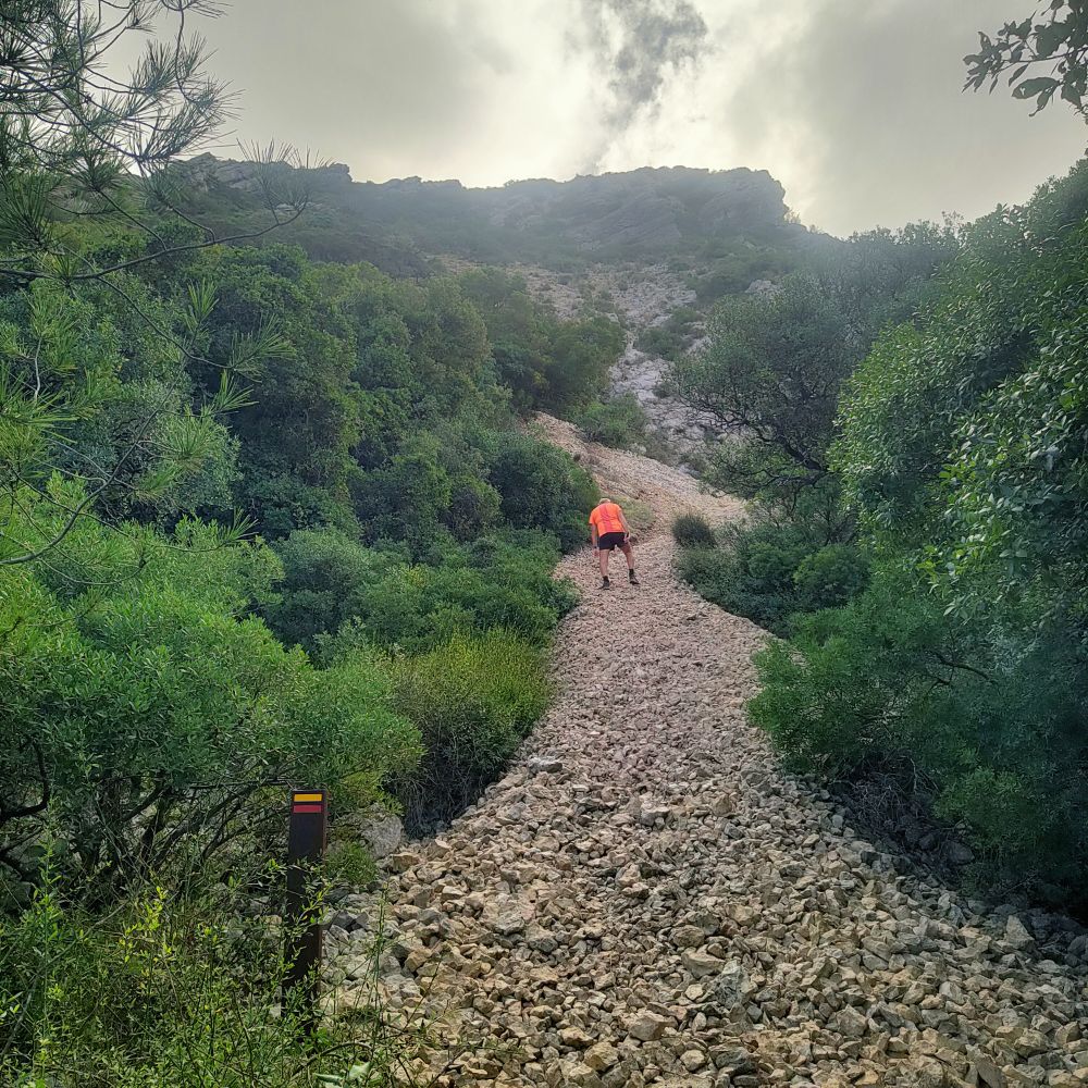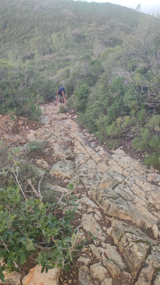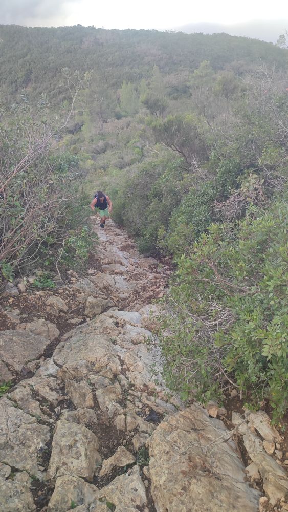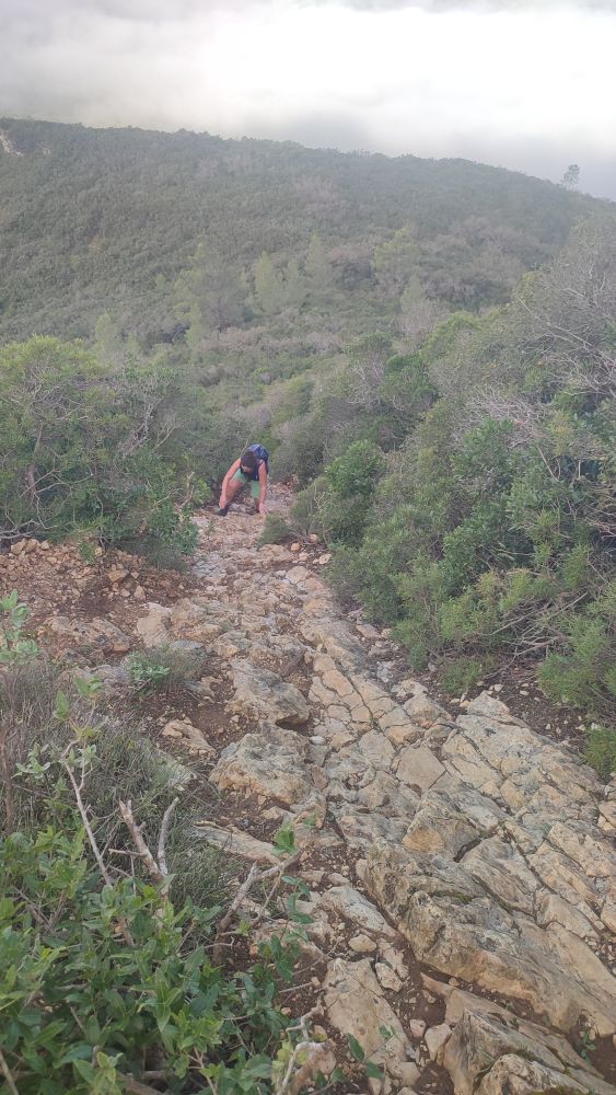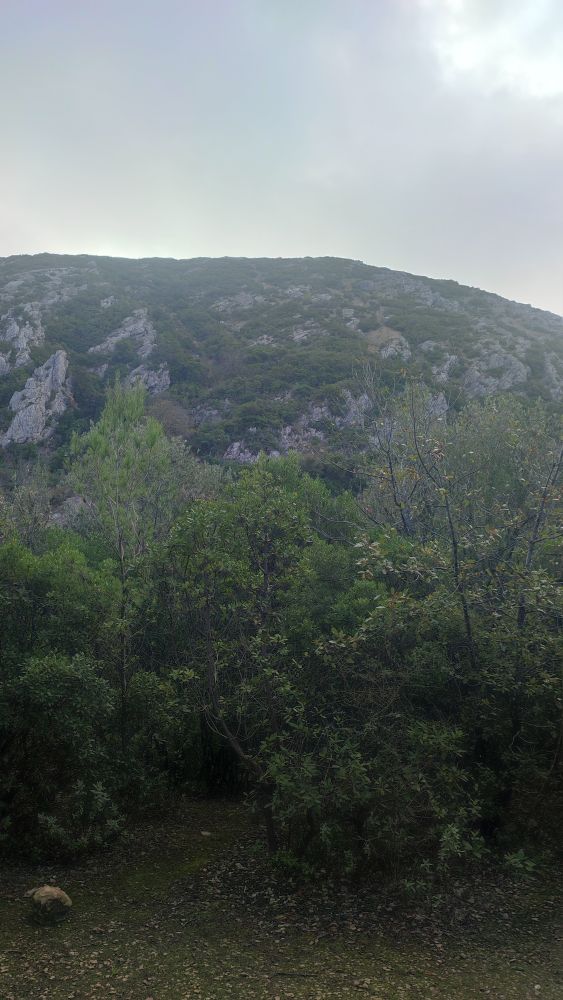 Cette fois-ci la piste devient sentier et commence à s’élever, il nous reste 1 km 300 jusqu’au sommet. Nous sommes à 150 mètres d’altitude pour atteindre les 502, il nous faut gravir encore 351 mètres. La certitude nous gagne, nous allons à un moment donné nous trouver face à un mur.