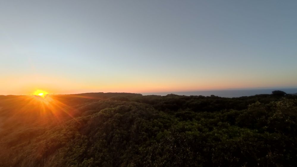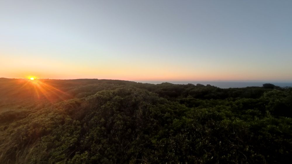 Au loin, non ce n’est pas une île, ce sont les montagnes derrière Lisbonne qui s’élèvent au-dessus de la brume. Nous sommes au cap d’Espichel, Lisbonne est tout proche.