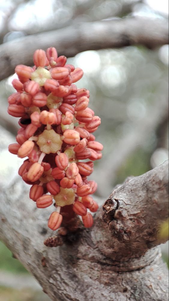 Le caroubier, cet arbre qui paraît torturé, mais qui inspire la force de vie, porte déjà ces petites fleurs directement sur le tronc, alors que l’oranger se pavane, garnit de ses fruits.
