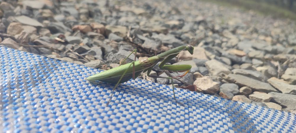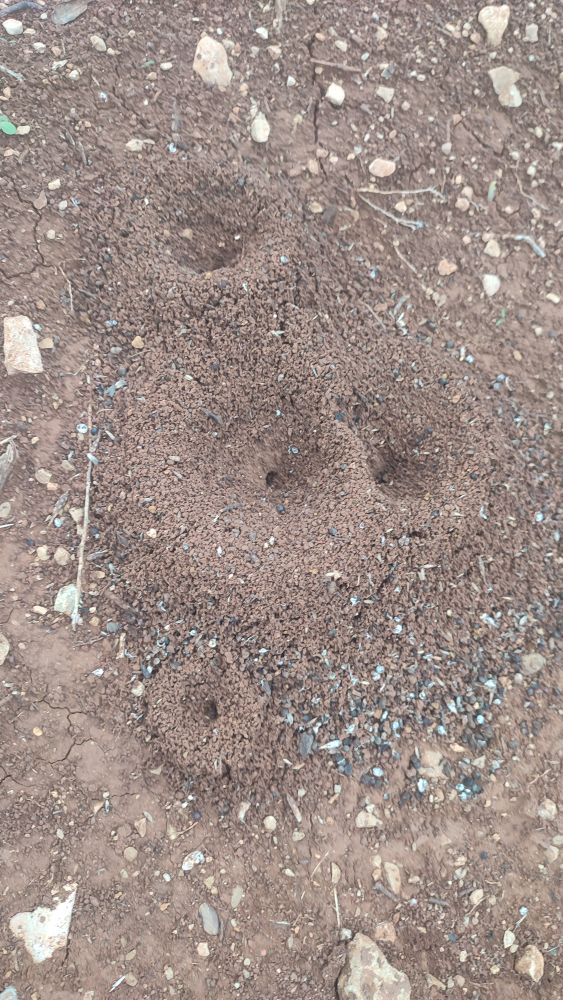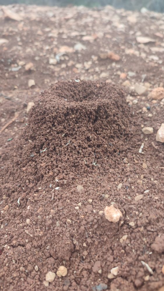 A côté les fourmis restent imperturbables et construisent, creusent, rejettent la terre en petit monticule volcanique, peut-être craignent-elle la mante religieuse ?