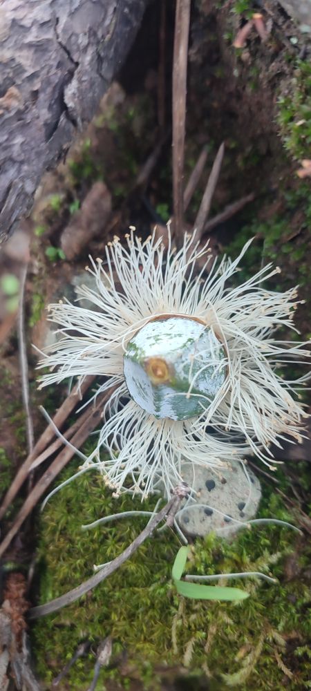 Les fleurs d’eucalyptus tombent déjà au sol et me font penser à une pieuvre voulant retrouver le fond des océans.