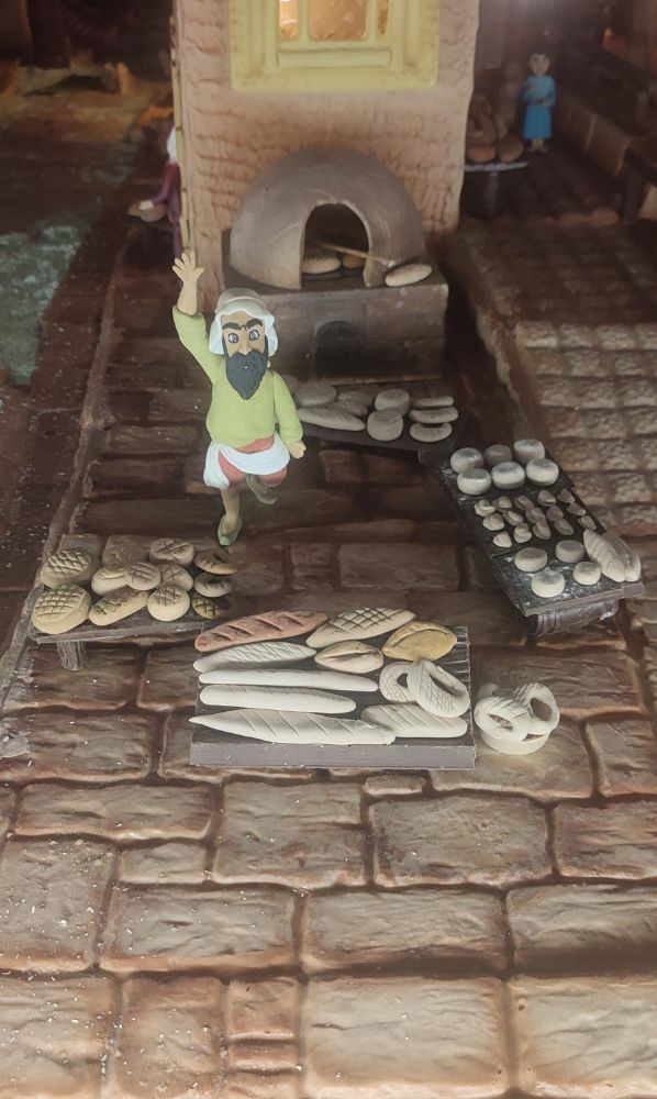 Le brouhaha de la vie quotidienne est interrompu par le troupeau de moutons, celui-ci s’éloigne et le boucher harangue la foule vantant les meilleurs charcuteries, concurrencé par son ami le boulanger dont le pain sort du four.