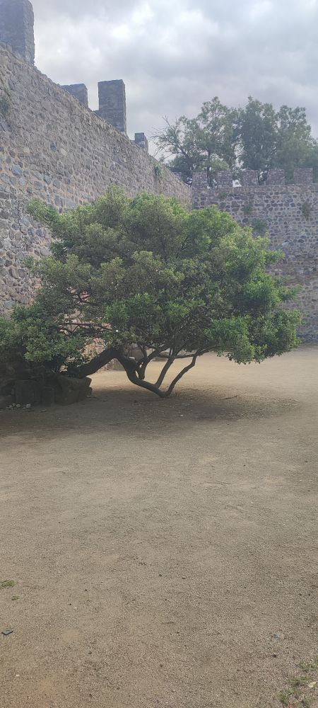 C’est un fusain du japon qui nous amuse, il est obligé de poser le coude au sol pour supporter son houppier fatigué des guerroyages des seigneurs.