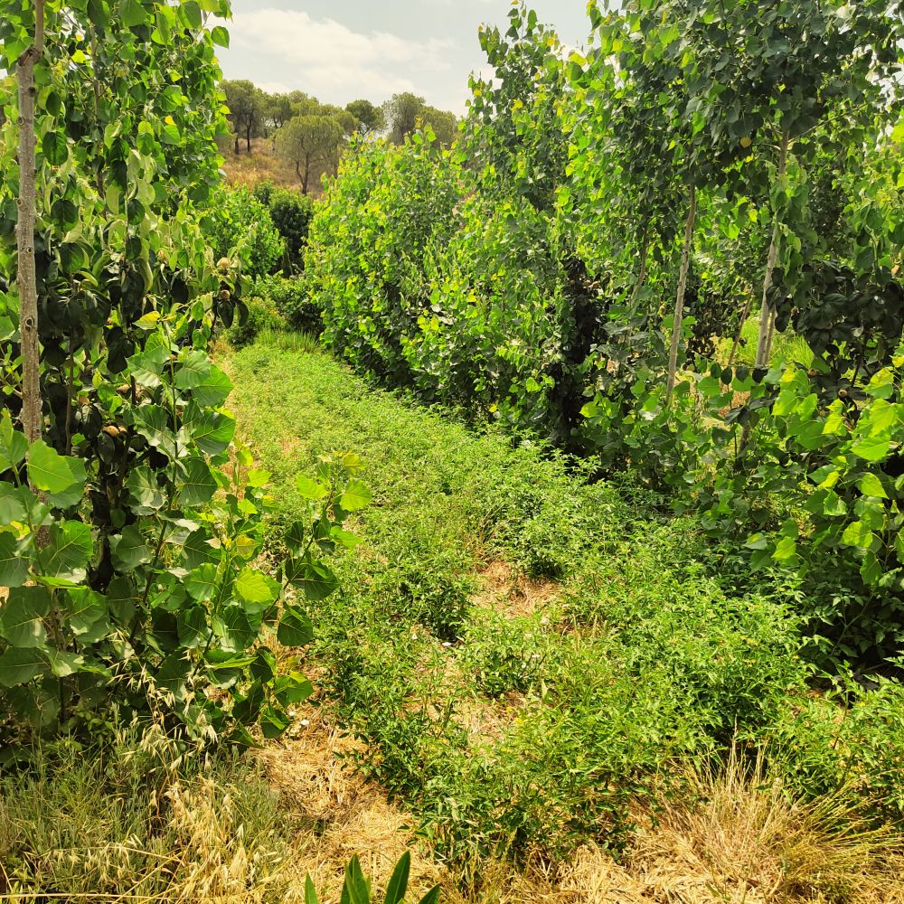 Notre premier constat c’est la présence de rang d’arbres de variétés différentes. Dans un rang alterne du peuplier, mais aussi des fruitiers. Sont privilégiés des arbres qui poussent rapidement et vont de ce fait offrir de l’ombre aux plantes plus basses.