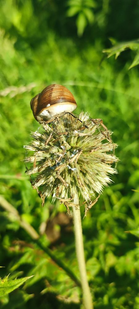 Et que fait cet escargot perché sur ce chardon en semence? Lui seul le sait, alors amusons nous de son acrobatie et laissons le à son expérience.
