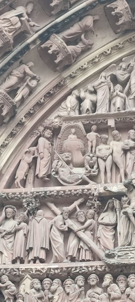 Le tympan est longuement admiré par des millions de visiteurs et pourtant ; qui remarque les statuts profanes ou païennes ?