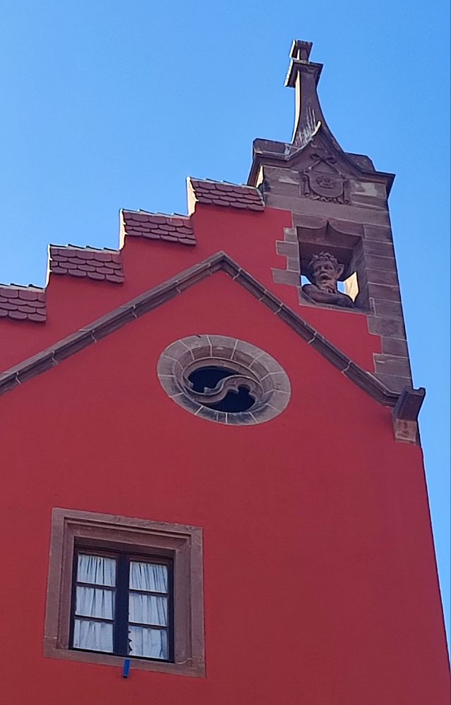 Mais qui aperçoit ce drôle de personnage niché dans une ouverture sur le pignon de droite ? Il est affublé de grandes oreilles, d’une barbe pointue et d’un regard de faune, il surveille la rue.