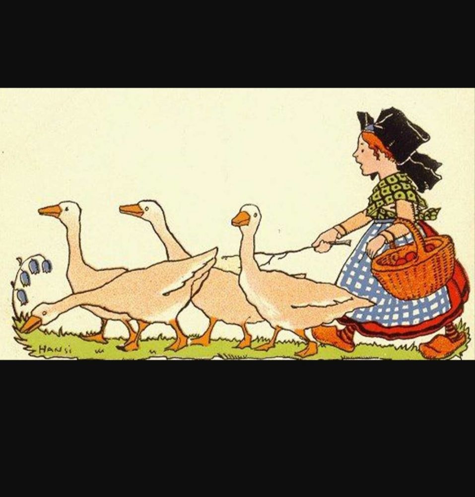 C’est l’oie qui va chercher les bébés dans les sources et fontaines aux enfants.