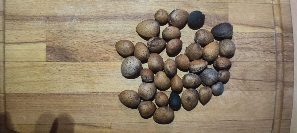 Mais voici le must de notre récolte, ce qui nous a fait sûrement le plus plaisir, car lors de l’acquisition du terrain le vendeur nous a parlé des oliviers et des caroubiers. C’est en défrichant que l’on a découvert quatre amandiers, ce fut une joie aussi belle que l’enfant qui voit apparaître le père Noël.